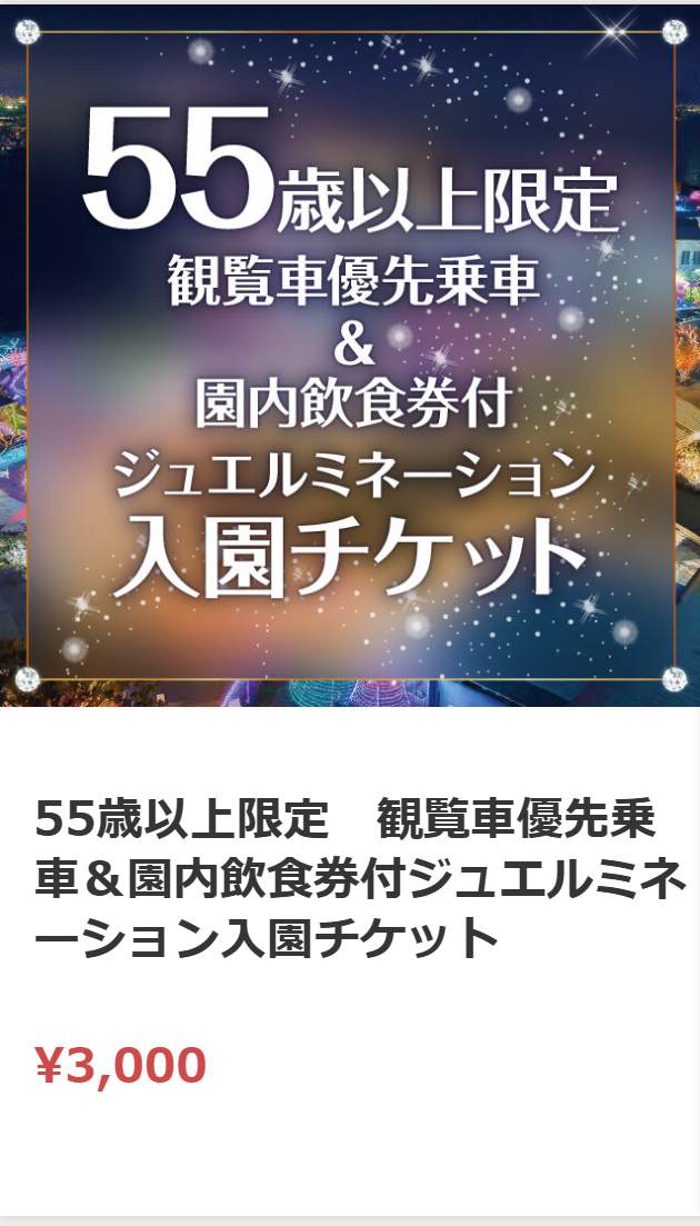 55歳以上のお客様を対象に、観覧車「Sky-Go-LAND」の優先乗車権付のりもの券と園内飲食券1,000円分付のジュエルミネーション入園チケットを最大1,200円引きの超お得な価格で販売中です。