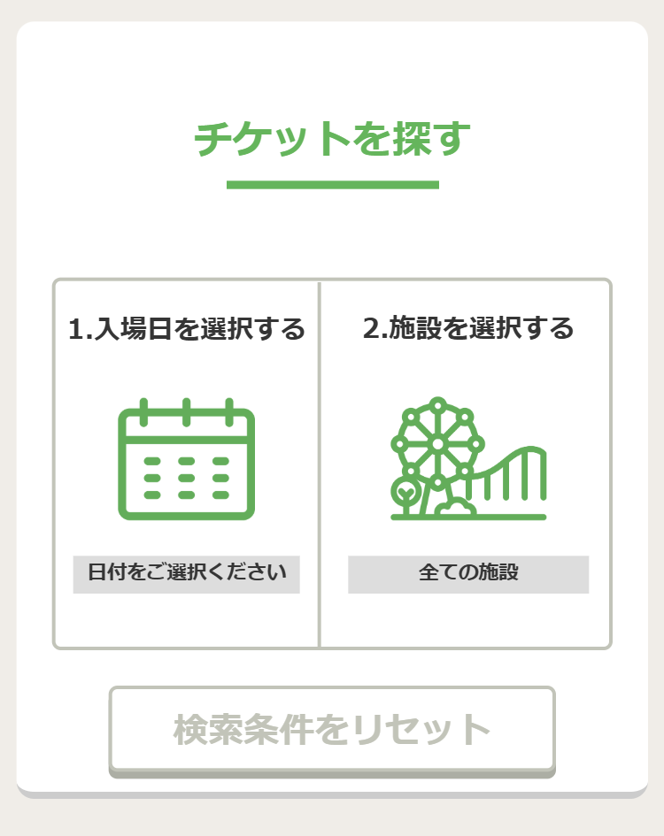 ③「チケットを探す」から入場日と施設(よみうりランド)を選択