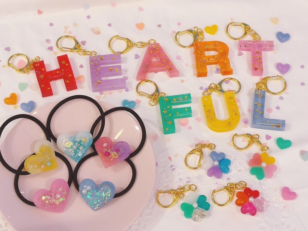 UVレジンを使ったハートのヘアゴムや、