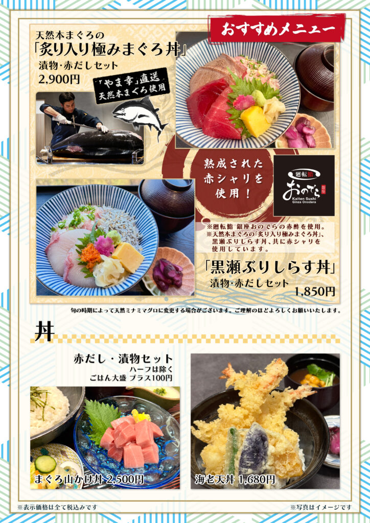 「廻転鮨 銀座おのでら」の赤酢を使用したコクのある赤シャリの上に天然本まぐろや鰤をのせた贅沢な海鮮丼が2品登場します!ぜひご堪能ください!