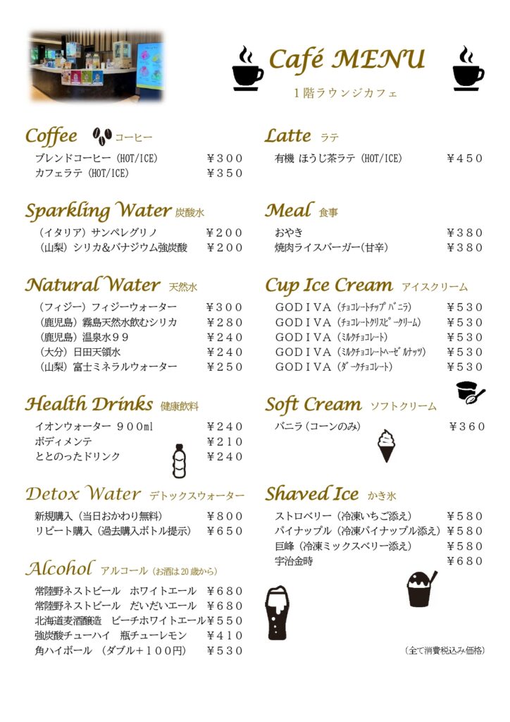 岩盤浴「火窯房」入口には、ソフトクリームや、クラフトビール、デトックスウォーターなどを販売するラウンジカフェがあります。