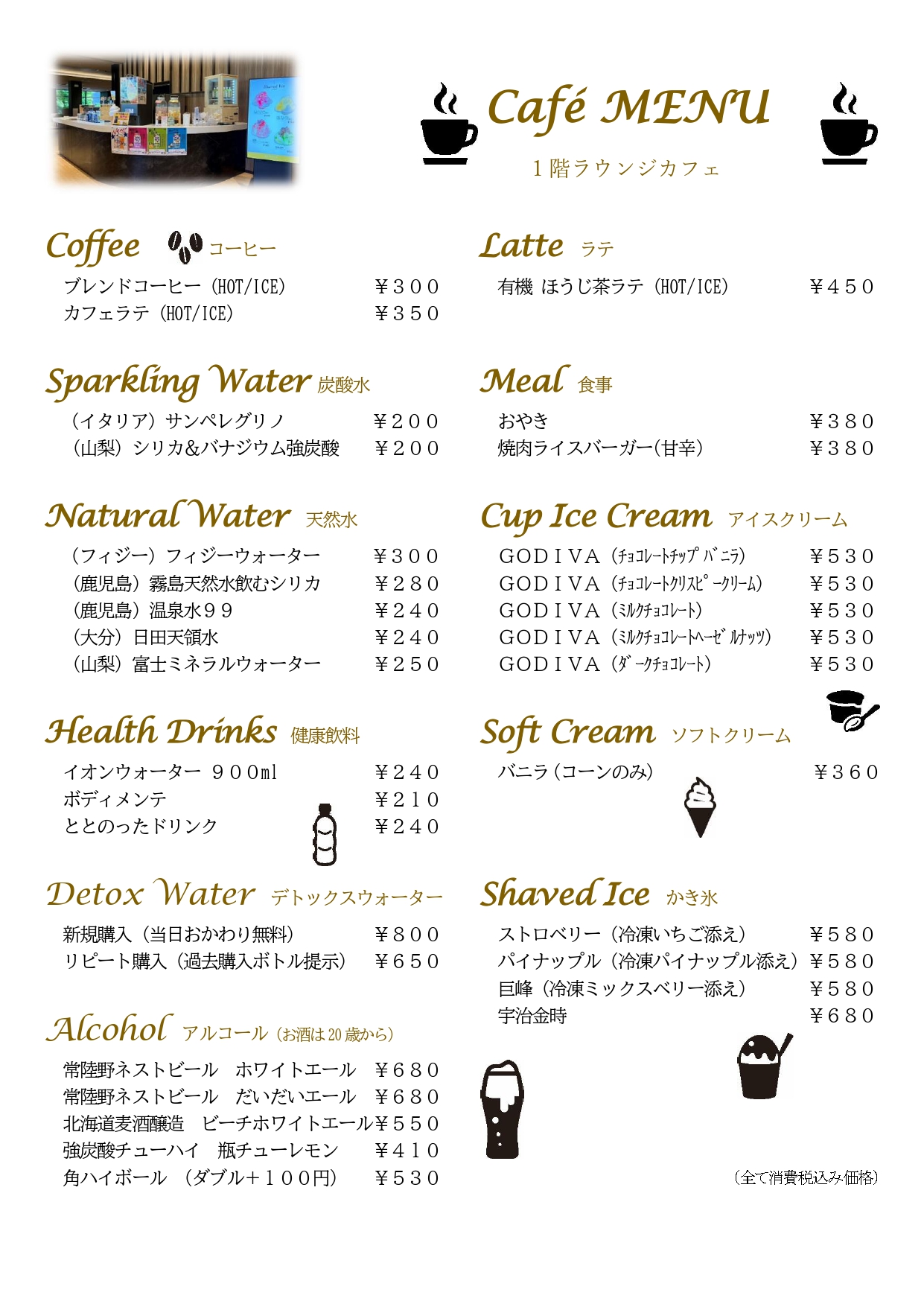 当店では毎日2種類のデトックスウォーターをご用意しております。ご購入当日は飲み放題となり、ボトルはお持ち帰りいただけます。次回ご来館時にご購入いただいたボトルをお持ちいただくと、割引価格でご提供させていただきます。