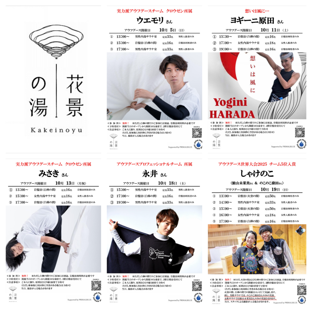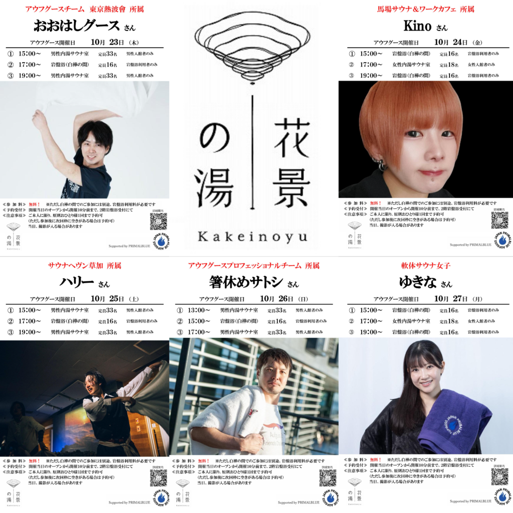 13:00火窯の間、14:00男性サウナ、15:00火窯の間 、16:00女性サウナ、17:00白樺の間