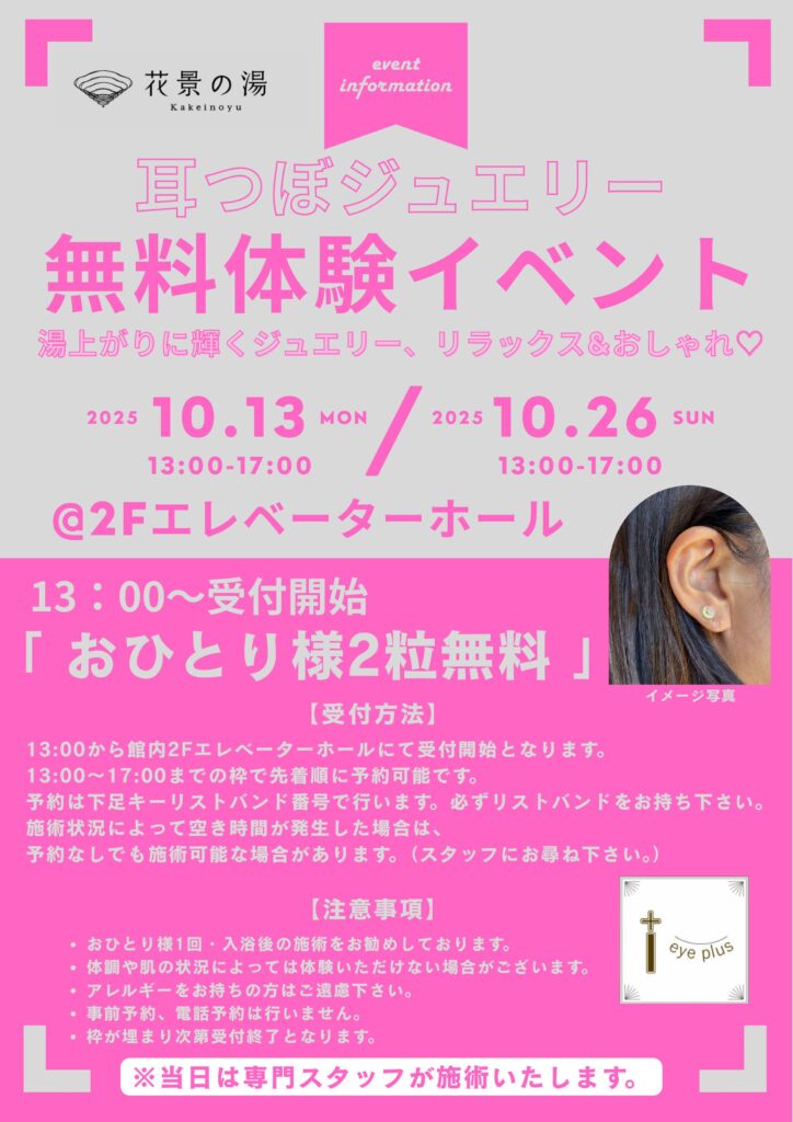 【内容】老若男女問わず、お一人様1回2粒まで無料で耳つぼジュエリーを施術します。