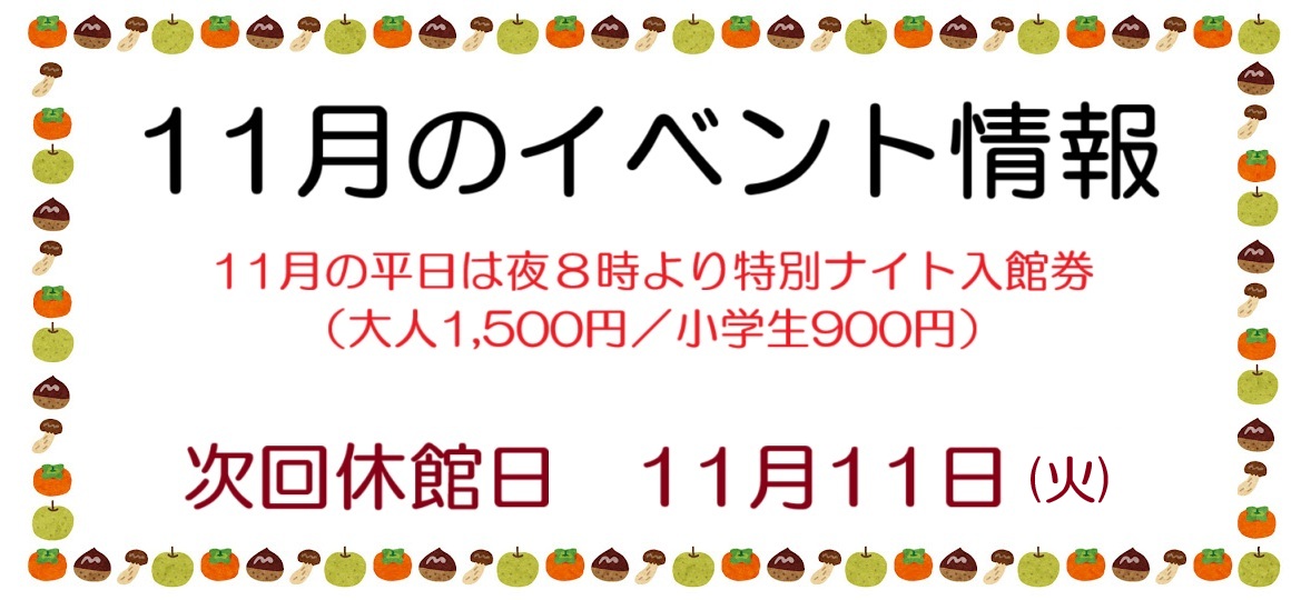 11/1(土)、11/2(日)、11/5(水)、11/7(金)、11/12(水)、11/19(水)、11/22(金)、11/23(日)、11/30(日)