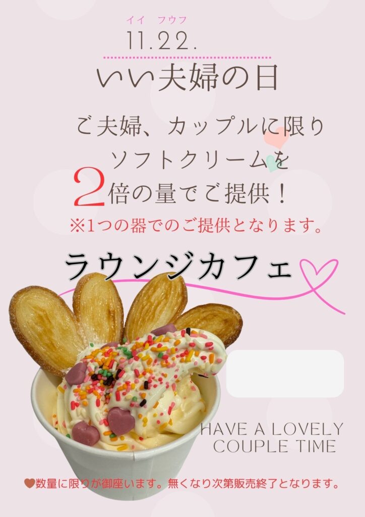 【期日】11/10(月)、11/17(月)1Fラウンジカフェで、通常360円で販売しているソフトクリームを110円の特別価格でご提供!