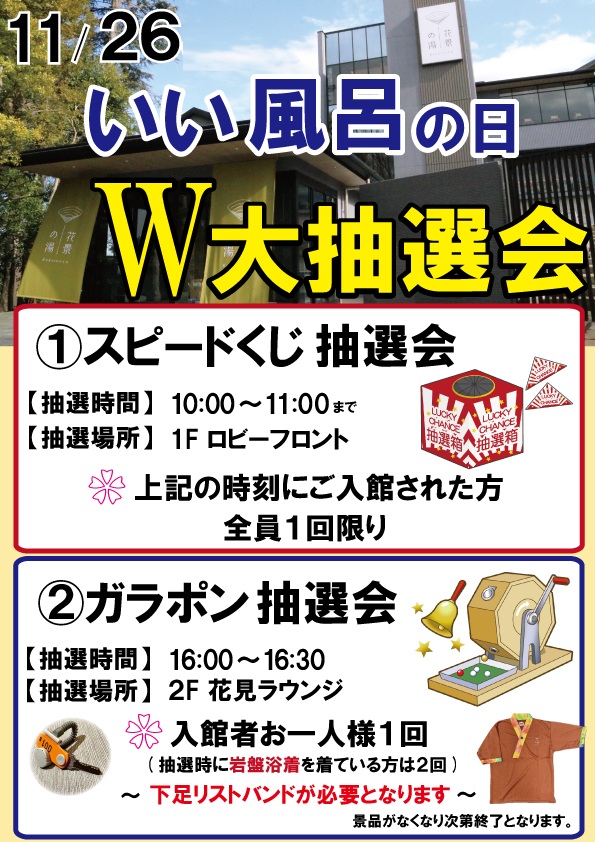 今月は「いい風呂の日」なので、1日に2回、抽選会を開催します!