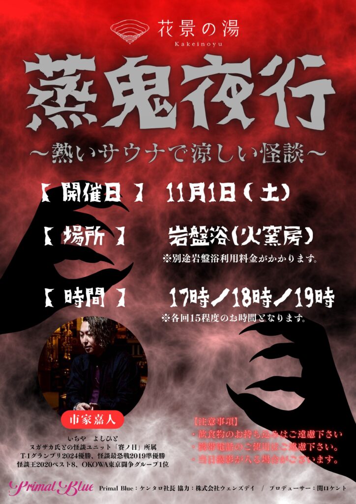 岩盤浴をご利用の方はどなたでも参加できます。「熱いサウナで涼しい怪談」という不思議な体験をこの夏ぜひどうぞ!