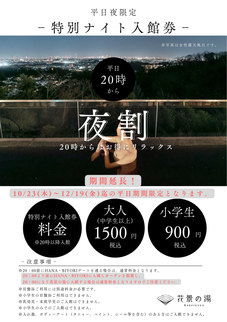 花景の湯では、12月19日(金)までの期間、平日限定で20時以降にお得な料金でご入館できる「特別ナイト入館券」を販売しております。