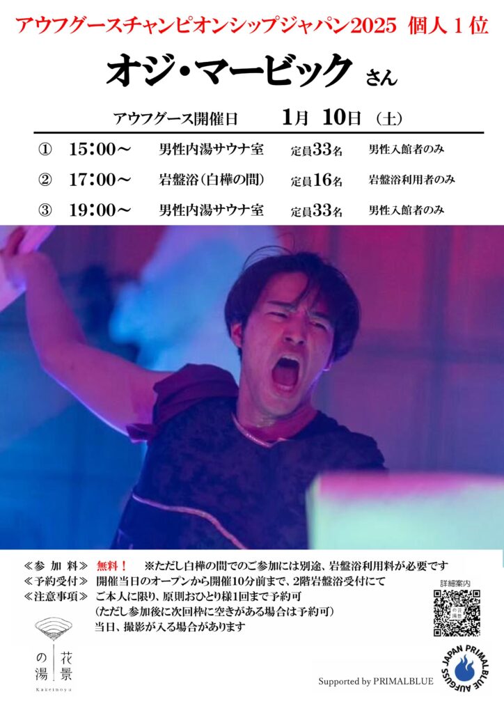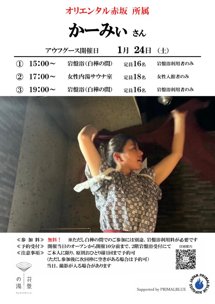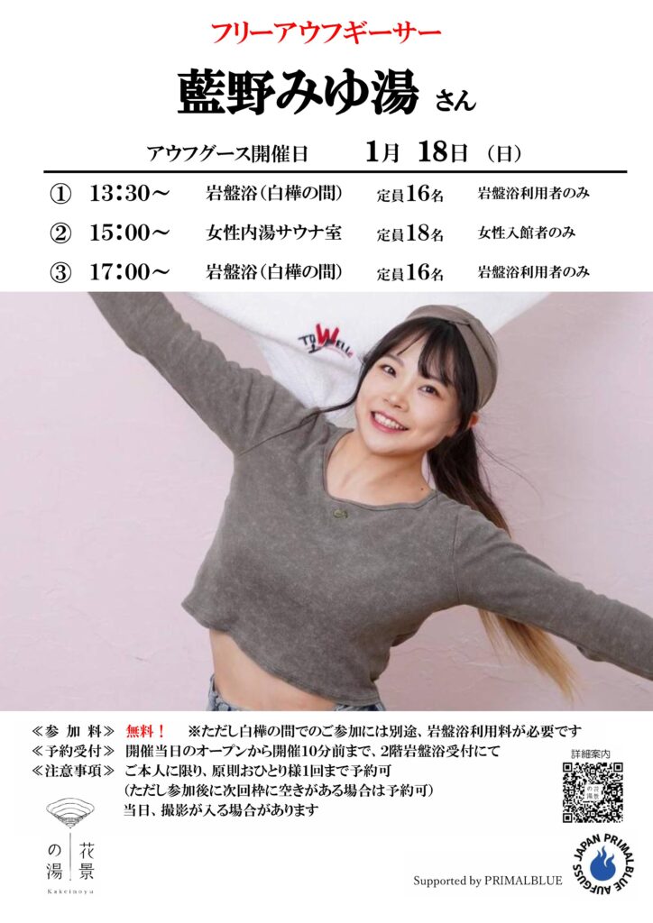 〇岩盤浴室内での開催となるため、ペットボトル等は持ち込むことができませんので、事前に十分に水分補給をお願いします。プログラム途中での入退場は自由です。