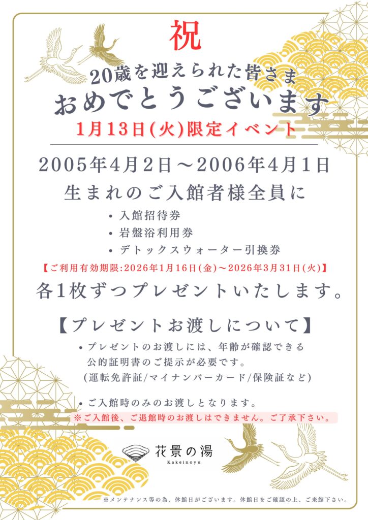 岩盤浴利用者の方、全員に次回お使いいただける岩盤浴ご利用券(平日のみ有効)をプレゼントさせていただきます。(花景の湯入館料は別途必要です)