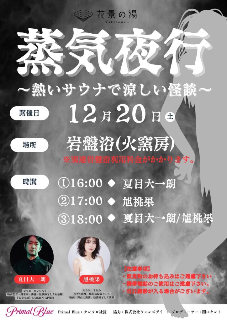 岩盤浴をご利用の方はどなたでも参加できます。「熱いサウナで涼しい怪談」という不思議な体験をこの夏ぜひどうぞ!