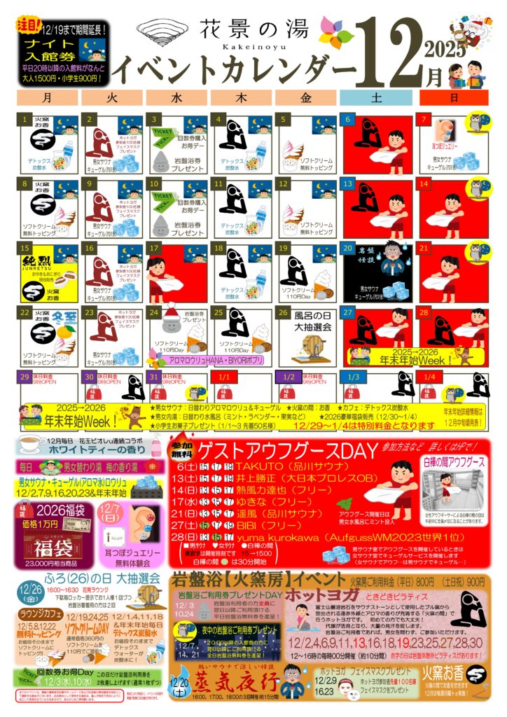 岩盤浴利用者の方、全員に次回お使いいただける岩盤浴ご利用券(平日のみ有効)をプレゼントさせていただきます。(花景の湯入館料は別途必要です)
