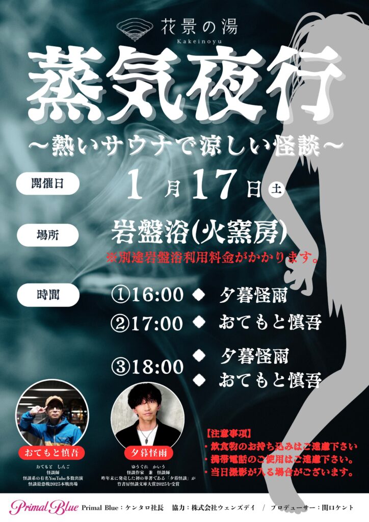 岩盤浴をご利用の方はどなたでも参加できます。「熱いサウナで涼しい怪談」という不思議な体験をこの夏ぜひどうぞ!