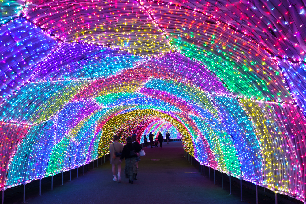 ジュエルミネーションの大人気スポットである全長約140mの光のトンネル。