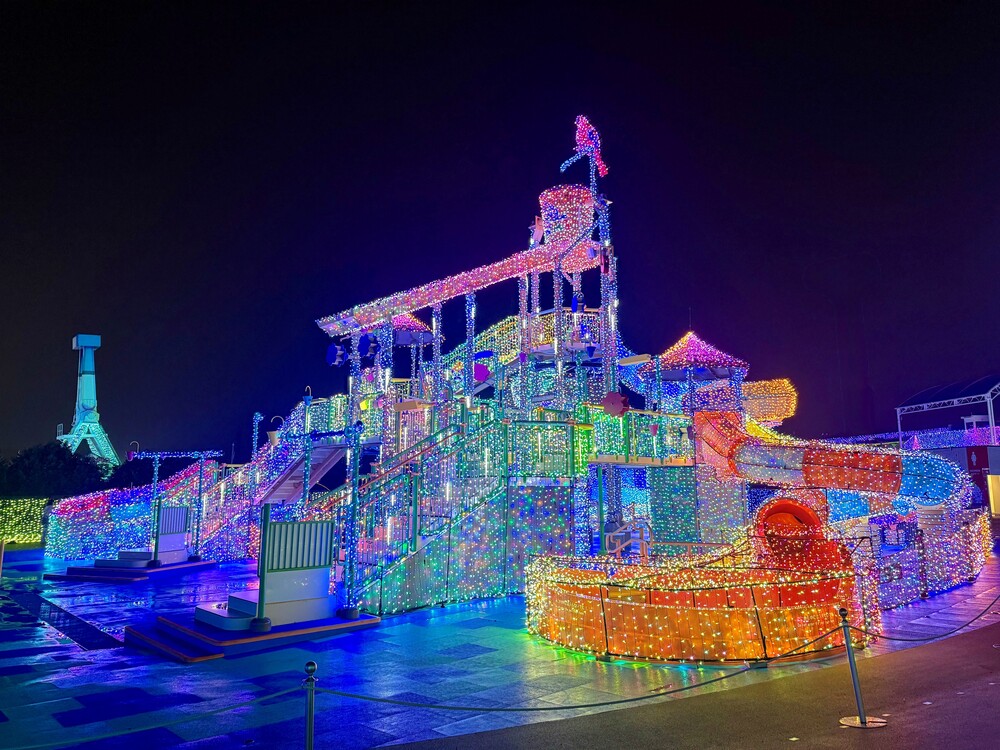 夏の間はプールWAIで大人気の「わいわいジャングル」が、ジュエルミネーションではまったく違う表情を見せます。