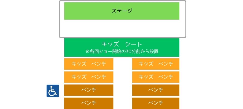 ・自由席ですが、ショー開始30分前より客席前方はキッズエリアとなります。