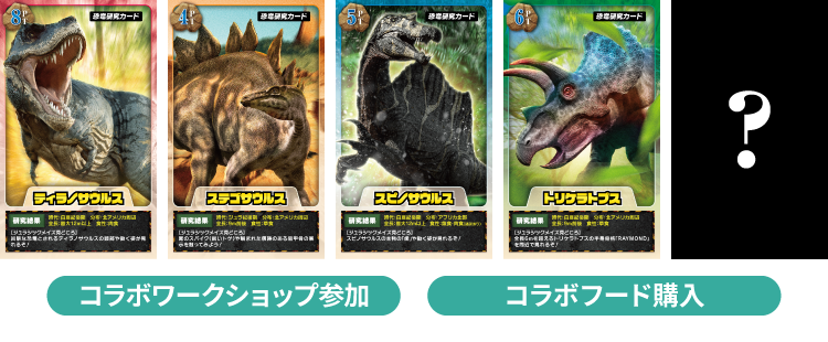 コラボワークショップご参加、コラボフードご購入ごとに「恐竜研究カード(ランダム5種 内1種ホログラム)」を1枚プレゼント!