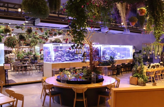 夜はアクアリウムが空間に滲み出しているような幻想的な風景に。