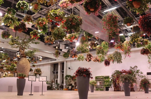 HANA・BIYORI館内では、日本最大級の300鉢を超えるフラワーシャンデリアがご覧いただけます。夜はライトアップされ、日中とは違う幻想的な美しさで、お客様を魅了します。