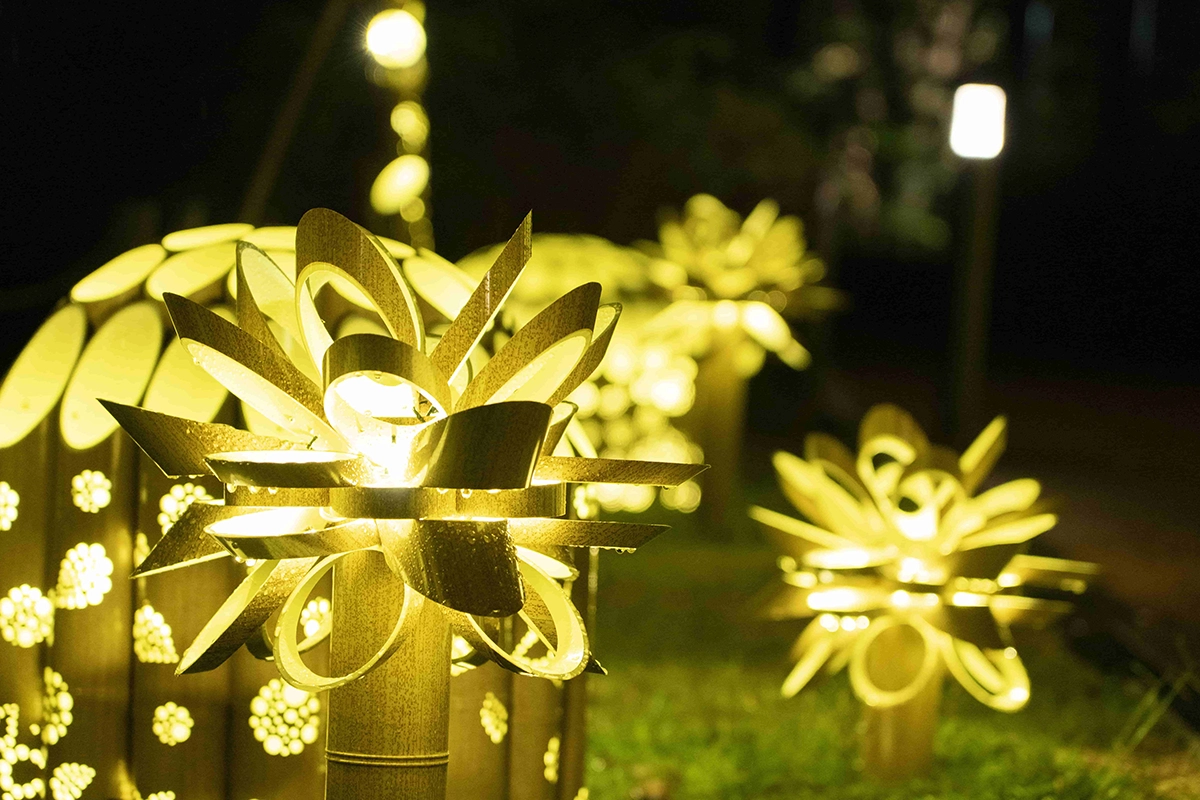 「HANAあかり」は竹オブジェにあかりを灯す竹あかりと、優美にライトアップされた樹木や花々・文化財により、