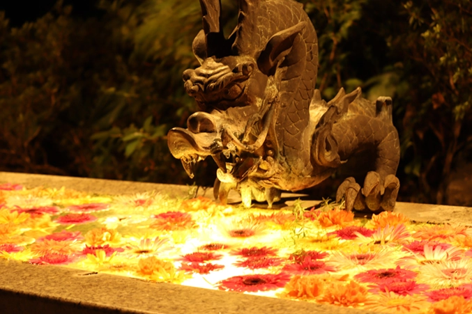 HANA・BIYORI人気のフォトスポットにもなっている、手水舎の水面に彩り豊かな花を浮かべた「花手水」にも柔らかな光が灯ります。