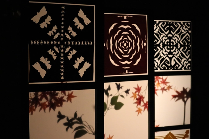 黒い格子枠から放たれる切り絵の色鮮やかな灯と花々が生み出す影の美しさをご覧いただけます。