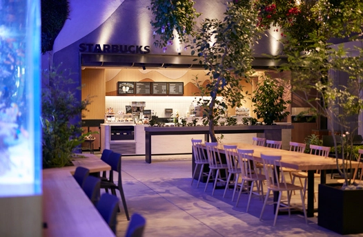 太陽の光がさんさんと降り注ぐ、花と緑に囲まれた空間に寄り添ったスペースでスターバックスのコーヒーとともに非日常の体験を楽しめます。日本で初めて、STARBUCKSのサイネージを本物の植栽で表現しております。