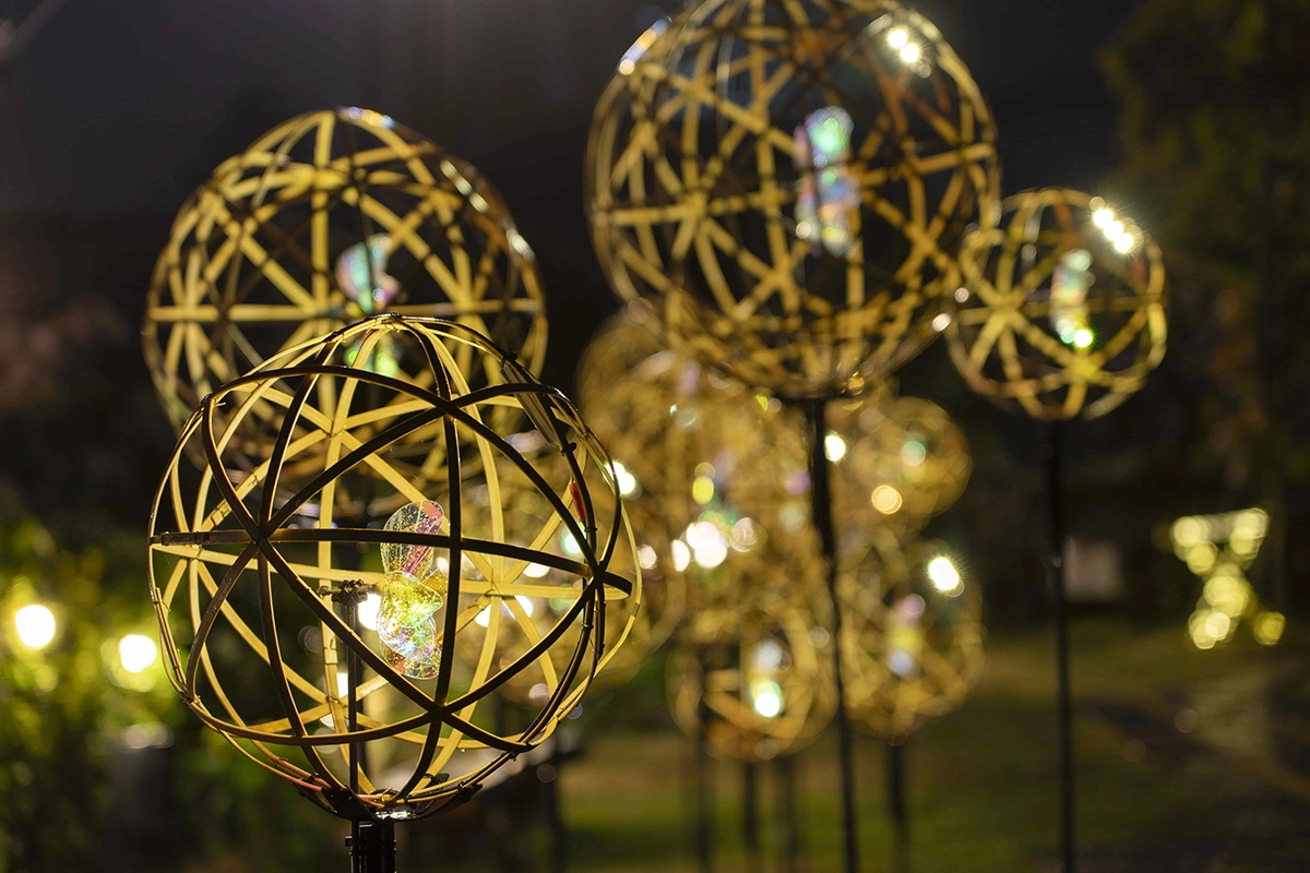HANA・BIYORI入園口を入ってすぐのエリアは宙に浮く竹毬に照らされた空間をお楽しみいただけます。